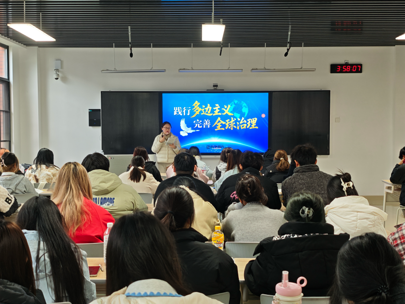 课堂上,杜婉秋老师围绕“变乱交织的国际形势”“全球治理的国际共识”“时代之问的中国答卷”三大课程要点,结合丰富的案例、详实的数据和生动的影像资料,对专题内容进行了系统深入的讲解。授课过程中,杜婉秋老师逐步引导学生认识中国在全球治理中提出的新理念、新倡议、新举措,展现了中国作为负责任大国的担当。
