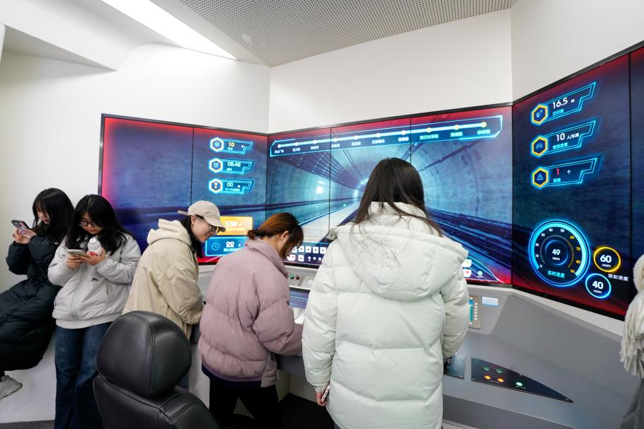 畅达交通展区,生动展示城市发达的交通网络。从大智门火车站,到全国第一座高铁站;从“一桥飞架南北 天堑变通途”,到如今建成十一座跨江大桥;从2004年地铁1号线开通,到2024年地铁通车里程突破500公里;从阳逻港作为长江中上游最大的集装箱枢纽港,到天河机场与花湖机场建成中部地区国际航空门户和空铁联运枢纽......武汉四通八达的交通网络赋予了“九省通衢”以现代化的典型,成为推动城市迅速发展、区域深度融合以及全国经济交流的强大引擎。同学们不仅了解了武汉交通发展的历程、现状和未来规划,还深度参与了体验活动。在模拟地铁驾驶项目中,学生通过操作平台和手柄,沉浸式体验地铁启动和制动,感受驾驶地铁的乐趣。学生们全面了解了武汉交通的建设成就和宏伟蓝图,体会交通对城市发展的重要意义。