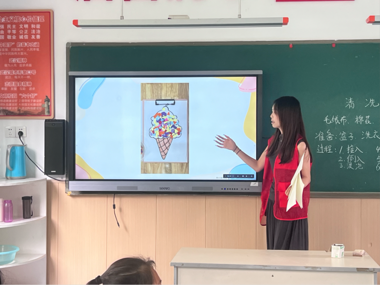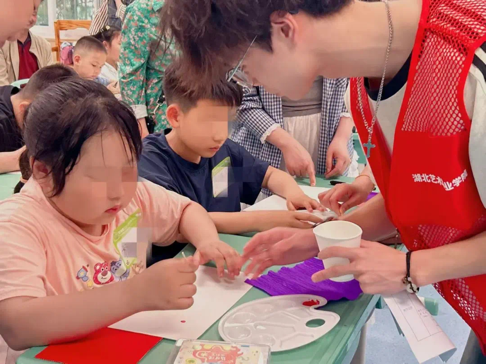 课堂上,同学们化身艺术导师,通过生动有趣的教学方式,引导孩子们在色彩的碰撞与交融中释放内心情绪,在自由创作环节里点燃奇思妙想。当指尖轻抚美纹纸的细腻、瓦楞纸的粗粝,孩子们的心头如同琴弦般被悄然拨动;当棉签蘸取水彩轻触画纸的瞬间,孩子们屏息注视着色彩如花蕾般缓缓晕染,教室里不时爆发出此起彼伏的惊叹。