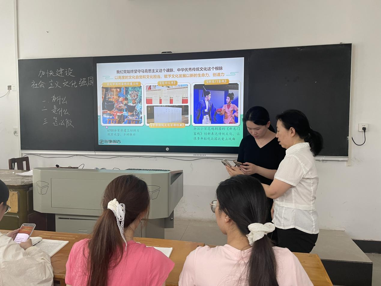 当日下午,初秀伟教授随堂听取了马克思主义学院思政教师朱诗忆所授的《形势与政策》课程。课堂上,朱诗忆老师以加快建设社会主义文化强国为主题,结合我校艺术实践,通过多媒体展示、互动问答等多样化教学方式,引导学生深入思考。学生们积极参与课堂互动,展现出对思政课程的浓厚兴趣与良好的学习风貌。